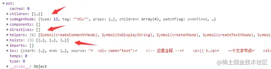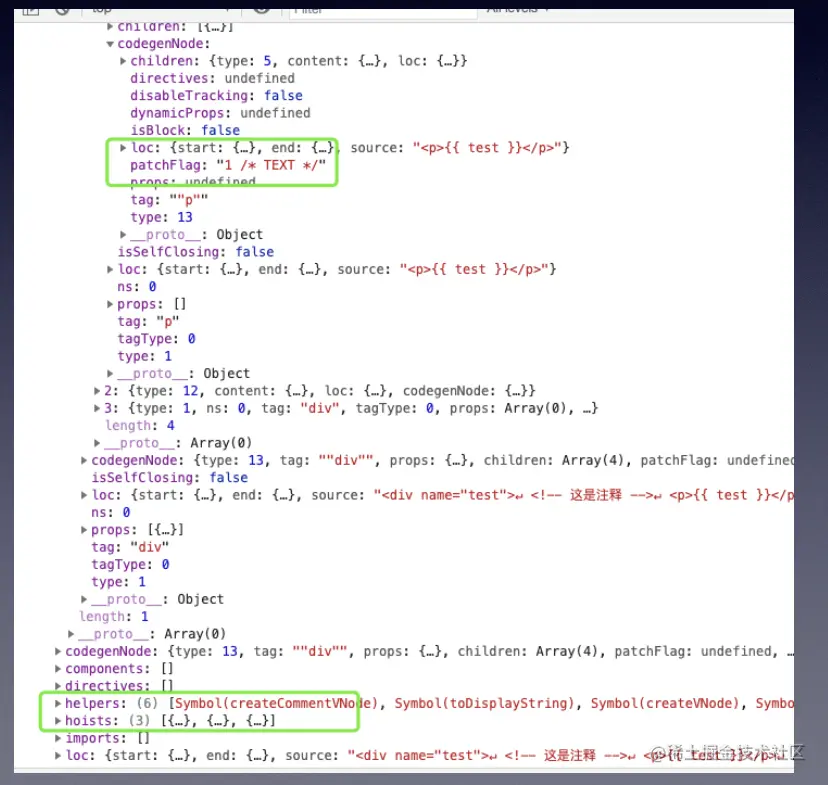 codegenNode、helpers 和 hoists 已经被填充上了相应的值。codegenNode 是生成代码要用到的数据,hoists 存储的是静态节点,helpers 存储的是创建 VNode 的函数名称(其实是 Symbol)
