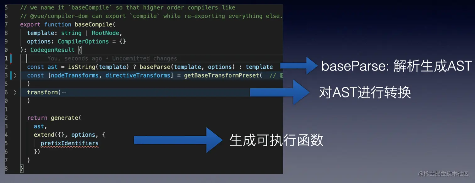 从编译后的内容上看两个有了一些区别,但整个编译过程还可以理解为分为三个阶段:Parsing(解析)、 Transformation(转换)、Code Generation(代码生成)。