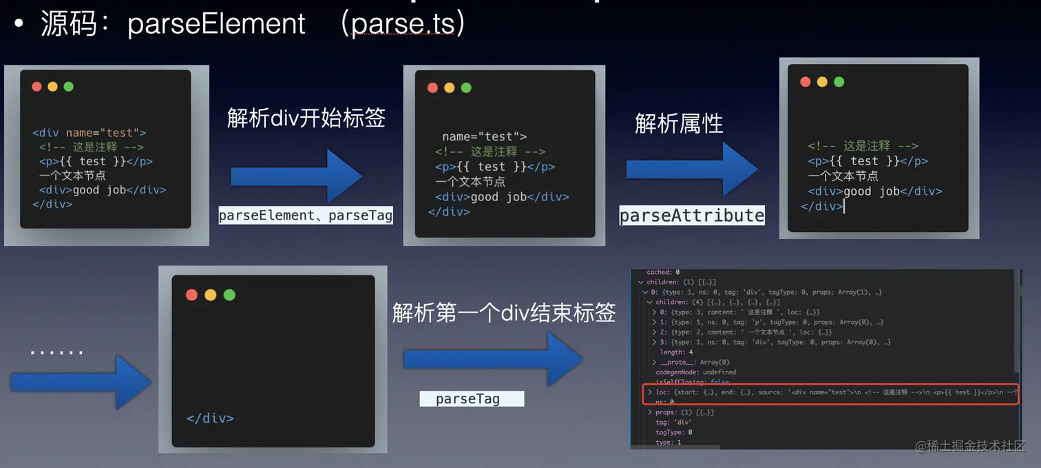 这里还有一点要提一下,Vue 会用一个栈 stack 来保存解析到的元素标签。当它遇到开始标签时,会将这个标签推入栈,遇到结束标签时,将刚才的标签弹出栈。它的作用是保存当前已经解析了,但还没解析完的元素标签。这个栈还有另一个作用,在解析到某个字节点时,通过 stack[stack.length - 1] 可以获取它的父元素。