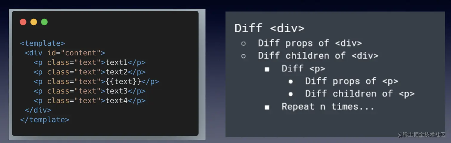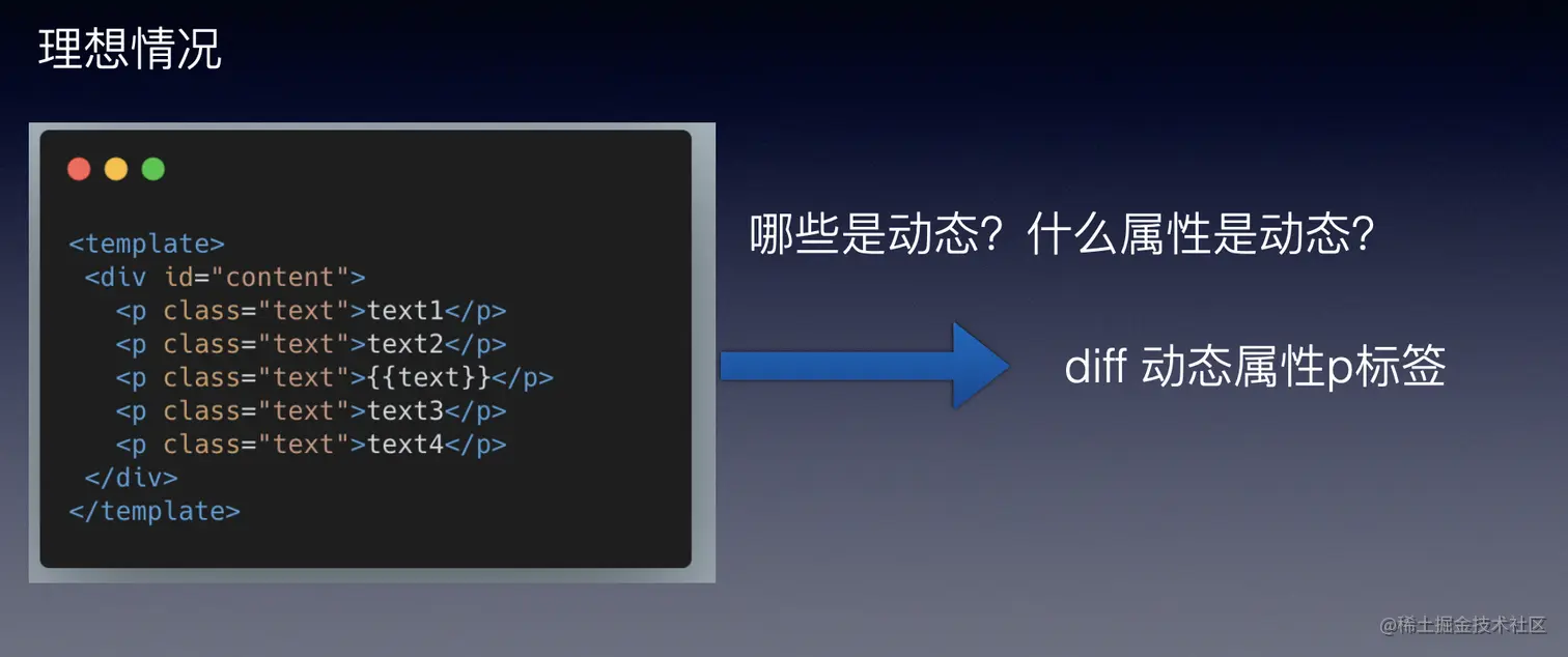 问题是:传统 vdom 的性能跟模版大小正相关,跟动态节点的数量无关。在一些组件整个模版内只有少量动态节点的情况下,静态无关的节点仍要对比,浪费性能