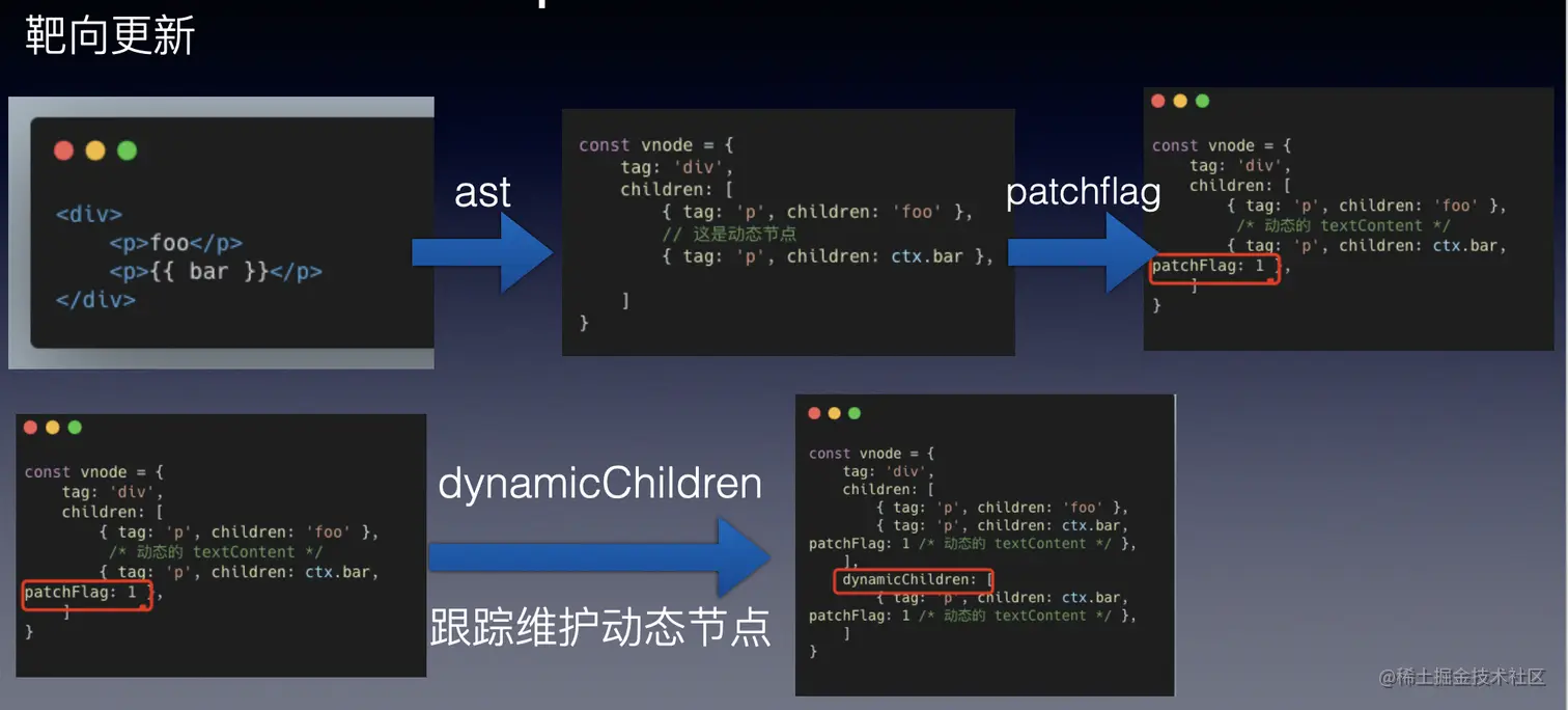 靶向更新 — 哪些节点是动态节点,以及为什么它是动态的(是绑定了动态的class?还是绑定了动态的style?亦或是其它动态的属性?)