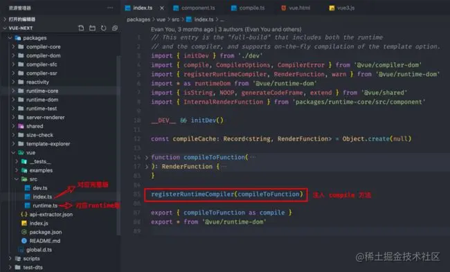 完整版与 runtime 版的差异就是,完整版会引入 compile 方法,如果是 vue-cli 生成的项目就会抹去这部分代码,将 compile 过程都放到打包的阶段,以此优化性能。runtime-dom 中提供了 registerRuntimeCompiler 方法用于注入 compile 方法。
