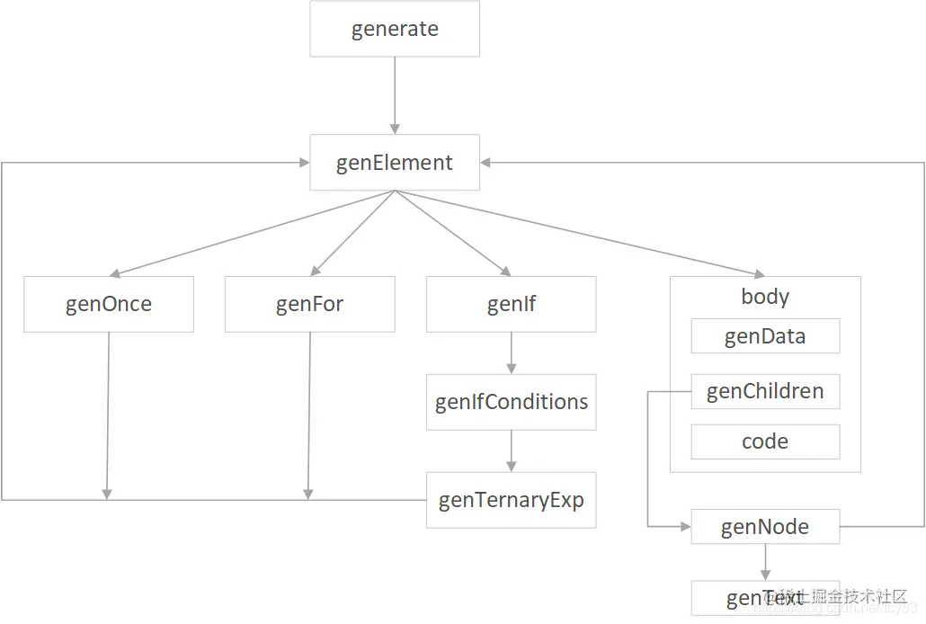 generate主要就是将AST模型转成render表达式,其中采用了大量的递归调用,主要的流程如下: