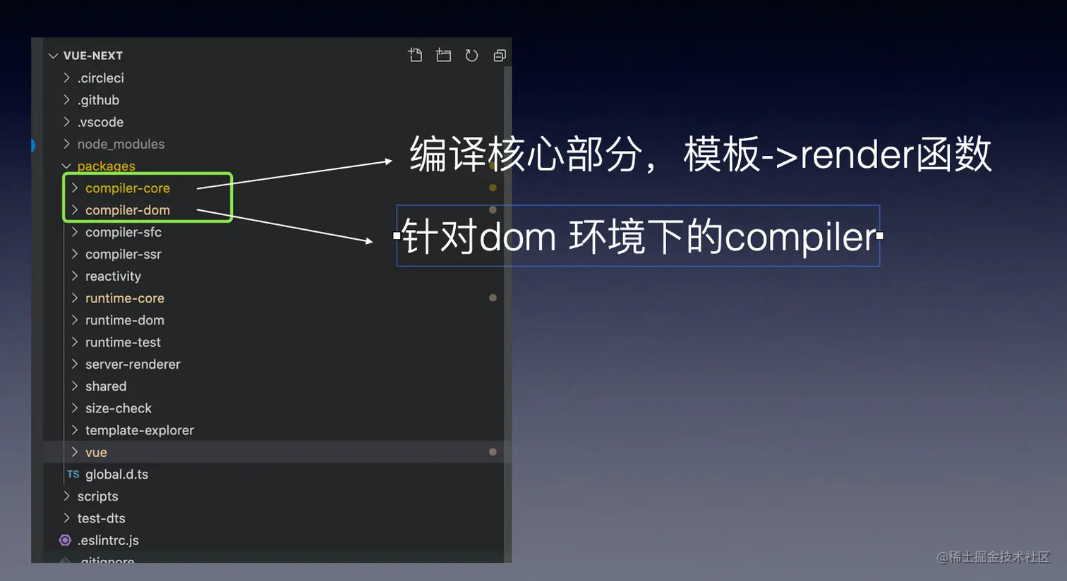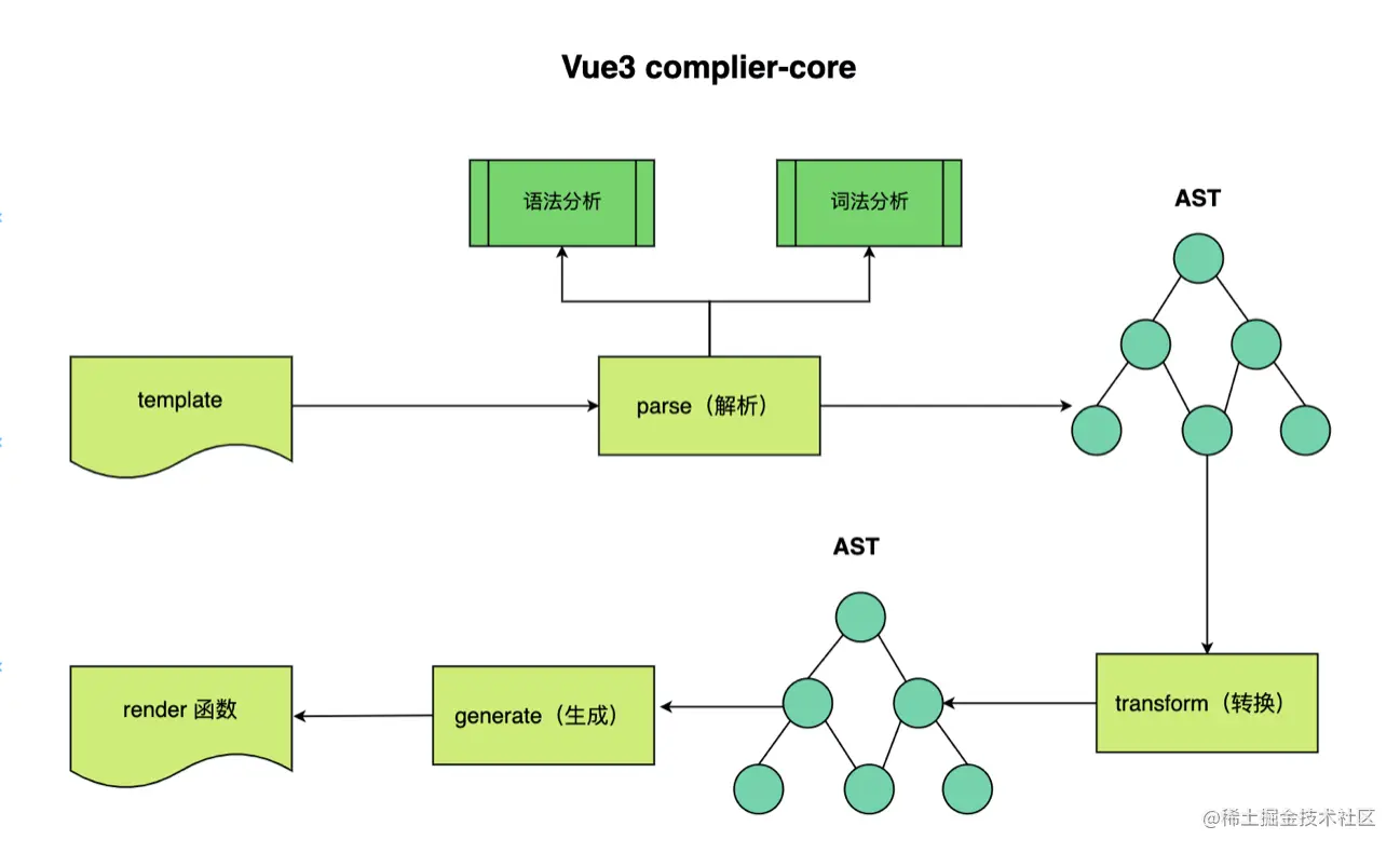 其中 compiler-core 模块是 Vue 编译的核心模块,并且是平台无关的。而剩下的三个都是在 compiler-core 的基础上针对不同的平台作了适配处理