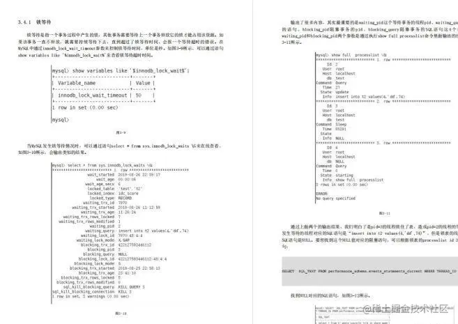 锁等待 锁等待是指一个事务过程中产生的锁,其他事务需要等待上一个事务释放它的锁才能占用该资源。如果该事务一直不释放,就需要持续等待下去,直到超过了锁等待时间,会报一个等待超时的错误。在MySQL中通过innodb_lock_wait_timeout参数来控制锁等待时间,单位是秒。如图3-9所示,可以通过语句show variables like '%innodb_lock_wait%'来查看锁等待超时时间。