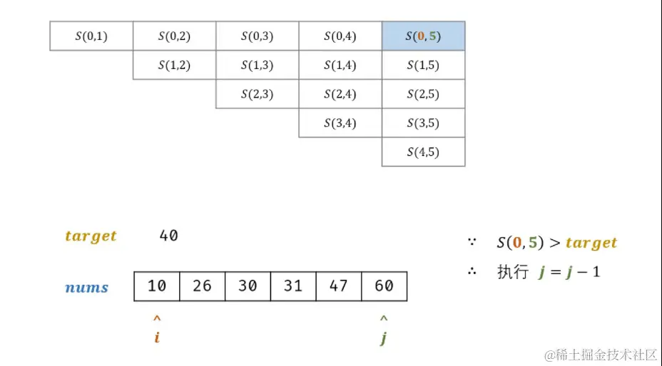 - 若s > target,则指针j向左移动,即执行j=j- 1 ;