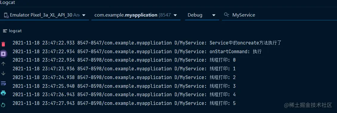 Service的生命周期和上述Activity的例子一样,这里不再赘述,日志打印如图所示