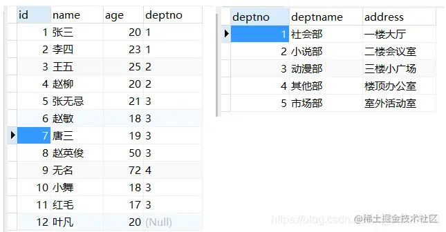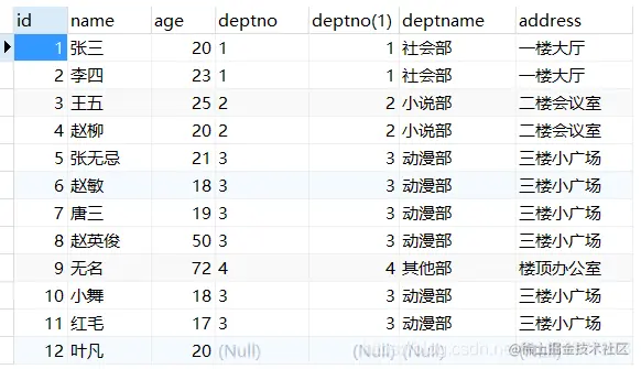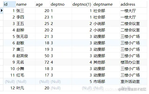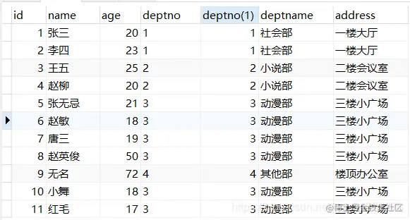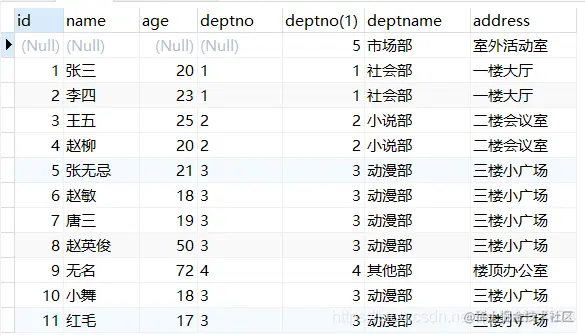 首先创建两张表: People表用于存放学生信息(有:id,姓名,年龄,部门字段) Dept表存放部门信息(有:部门编号,部门名称,部门位置字段)