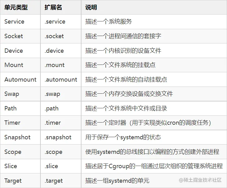 systemctl 命令用于管理各种类型的systemd单元,可以使用 “systemctl -t help” 命令来查询systemd支持的单元类型
