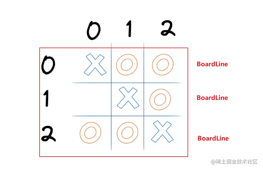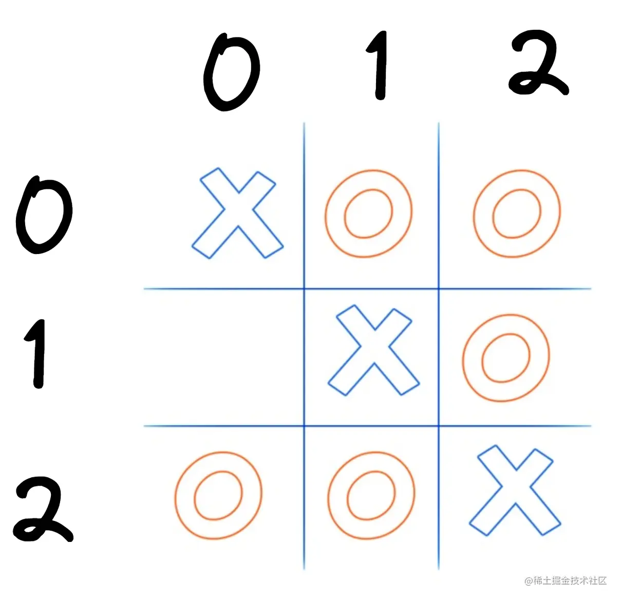 整个棋盘,我们可以图上加上索引,抽象成一个3*3的二维数组。