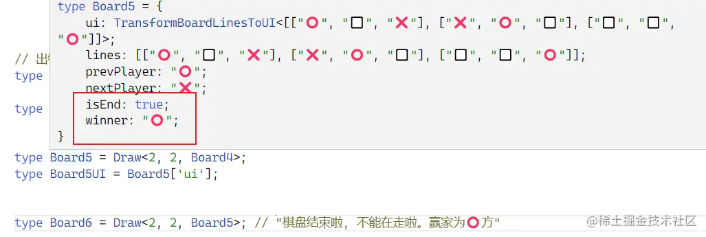 type CheckDrawStepLegal<X extends KeyOfBoardLines, Y extends KeyOfBoardLine, Lines extends BoardLines> = Lines[X][Y] extends '❌' | '⭕️' ? false : true;