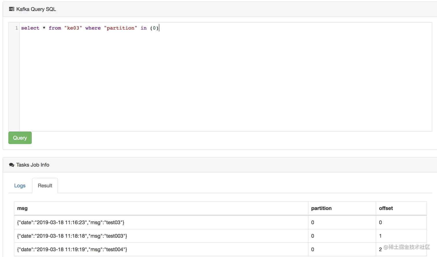 执行跨集群迁移命令后,目标集群中使用Kafka Eagle中查看Topic Size大小看是否与源集群的Topic Size大小相等,或者使用SQL语句,验证是否有数据迁移过来,结果如下图所示: