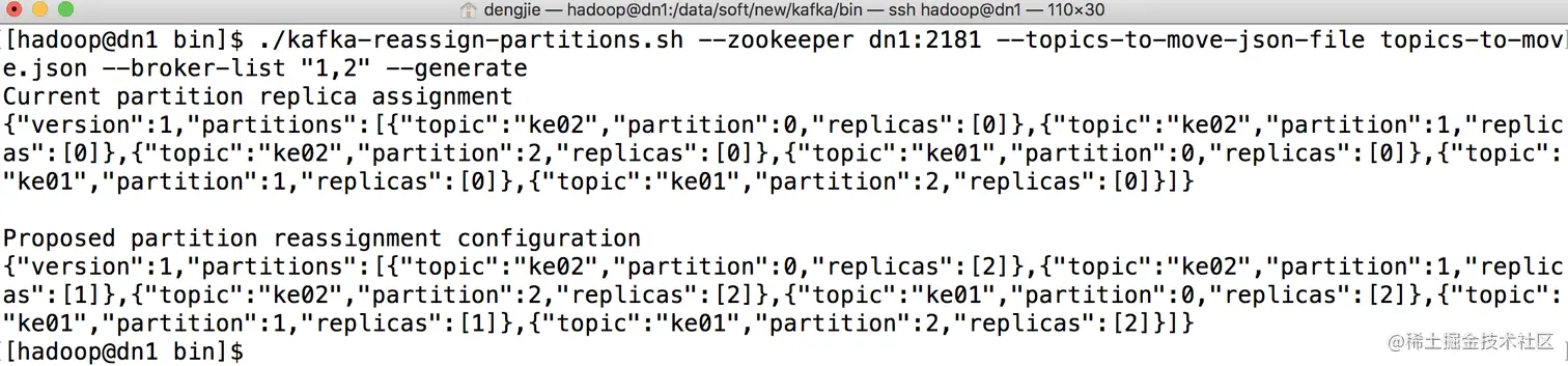 > bin/kafka-reassign-partitions.sh --zookeeper dn1:2181 --topics-to-move-json-file topics-to-move.json --broker-list "1,2" --generate