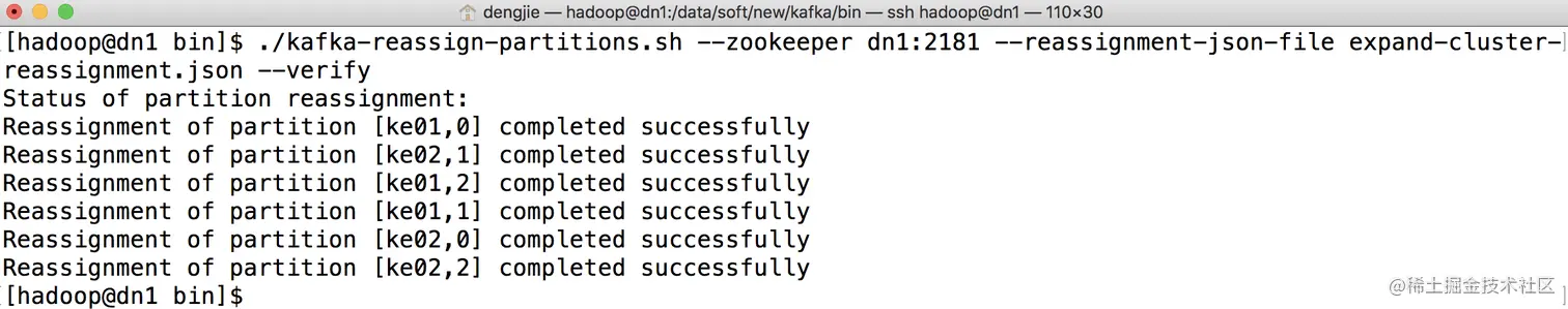> ./kafka-reassign-partitions.sh --zookeeper dn1:2181 --reassignment-json-file expand-cluster-reassignment.json --verify