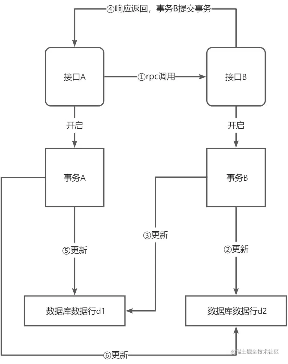 - 首先接口A不需要等待接口B的返回就可以提交事务