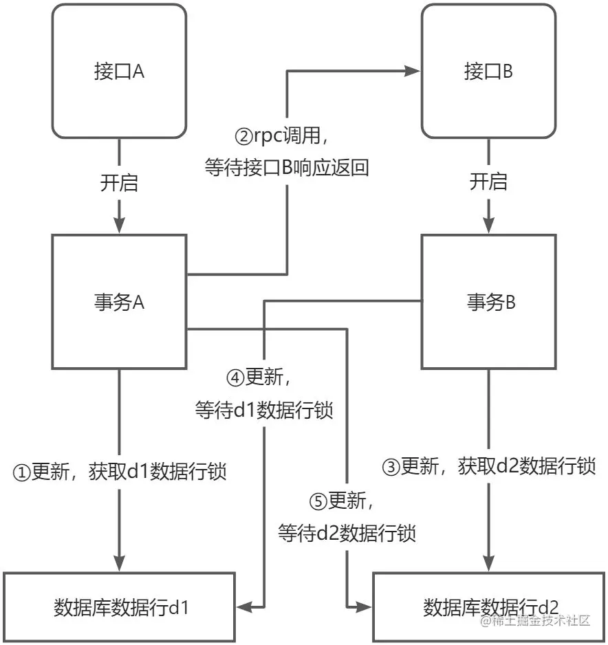 首先我们得保证两个或多个开启事务的接口,对数据库数据的处理尽量避免交叉更新,应该按顺序更新。