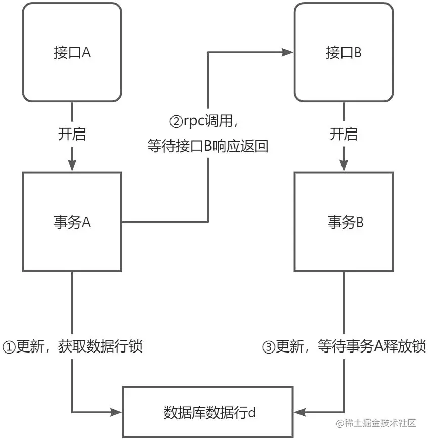 - 通过RPC调用接口B,接口A等待接口B的响应返回才能进行事务的提交