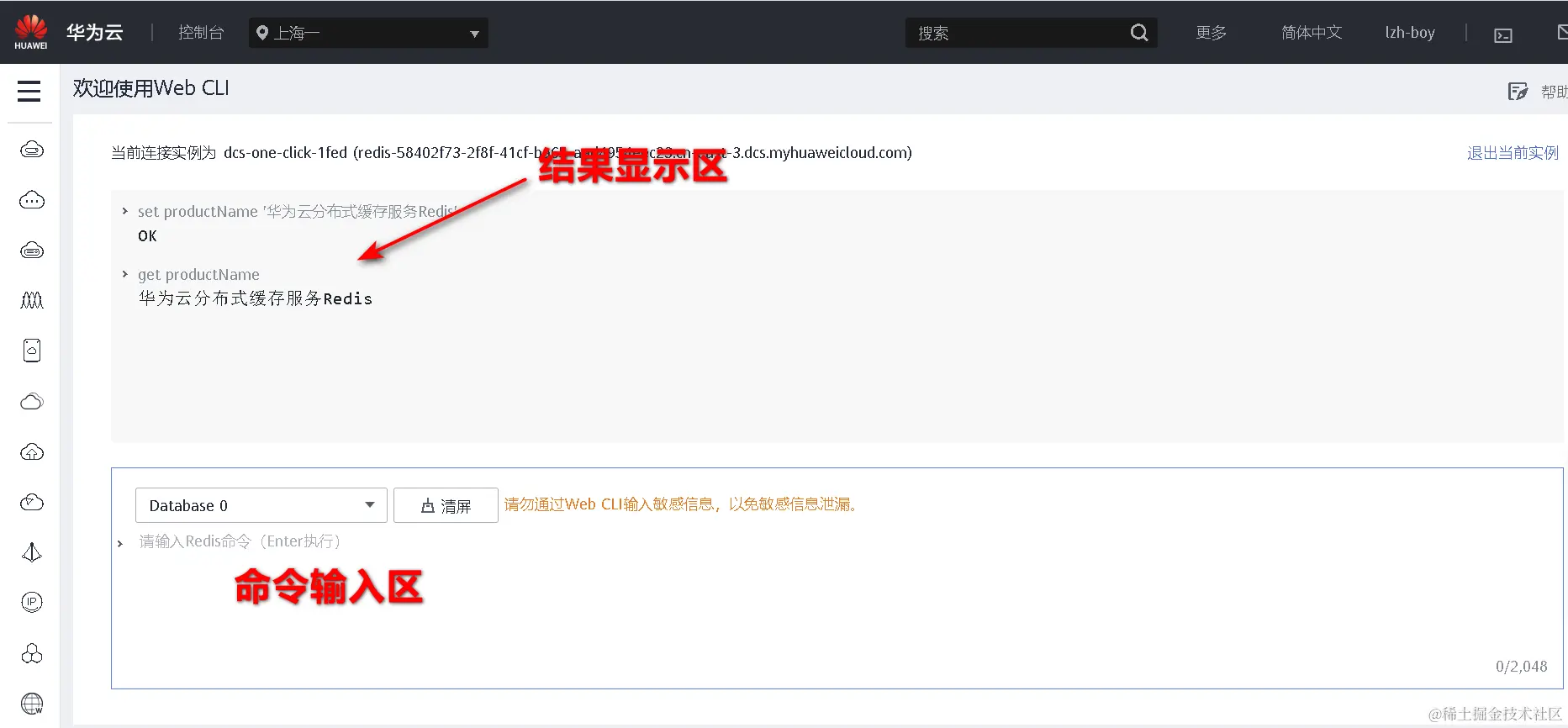 - 华为Redis提供了Web CLI功能,可以命令也有智能提示,极大的挺高了使用效率,如下所示