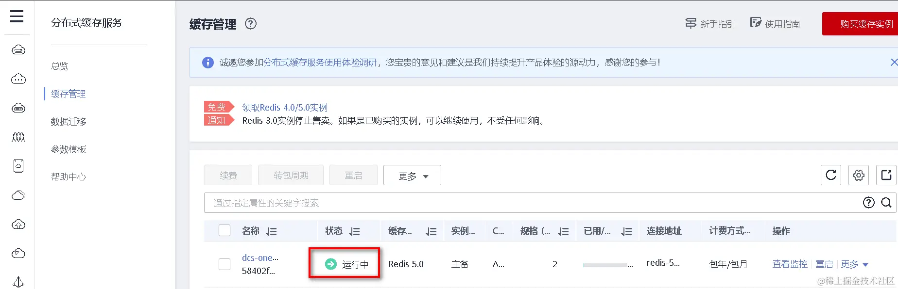 - 创建完成后,在控制台即可看到Redis实例,等状态变成运行中,即表示Redis已经部署完成,可以正常使用了,同时也提供了数据迁移、参数模板等功能方便Redis使用。点击产品名字,可以查看Redis实例的具体信息。