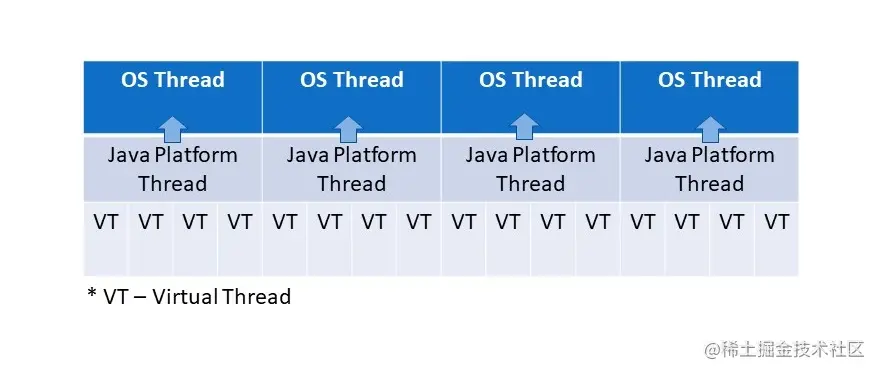 值得一提的是,我们可以在一个应用程序中创建非常多的虚拟线程*(数百万*),而不依赖于平台线程的数量。这些虚拟线程是由JVM管理的,所以它们不会增加额外的上下文切换开销,因为它们是作为普通的Java对象存储在RAM中。