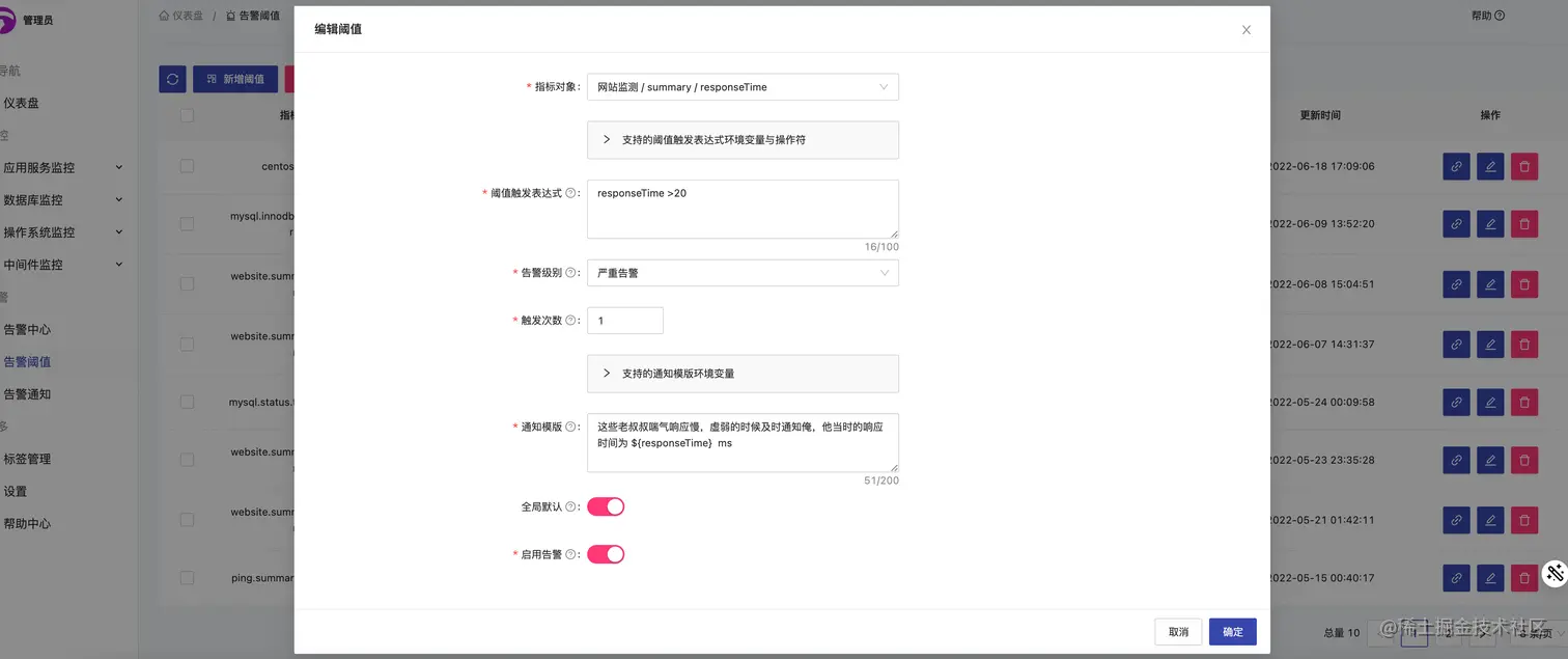 - 这下应该差不多了可以安心躺平了,刚躺下,你想起了爷爷之前的尊尊教诲,阿彪啊,创业难守夜更难,时时记得要未雨绸缪防患于未然啊。是哦,怎么能让产业毁于我这一代,于是乎你在hertzbeat对集团的重要人物指标都设置了告警阈值,他们一有小动作就马上通知你,将不该有的想法扼杀在摇篮中。