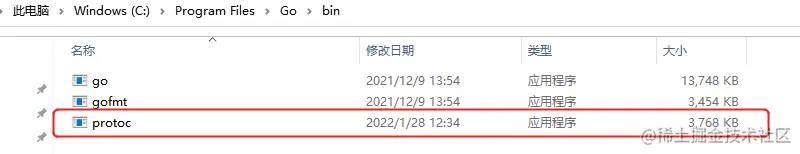 3、将bin文件夹下protoc应用程序复制到Go\bin: