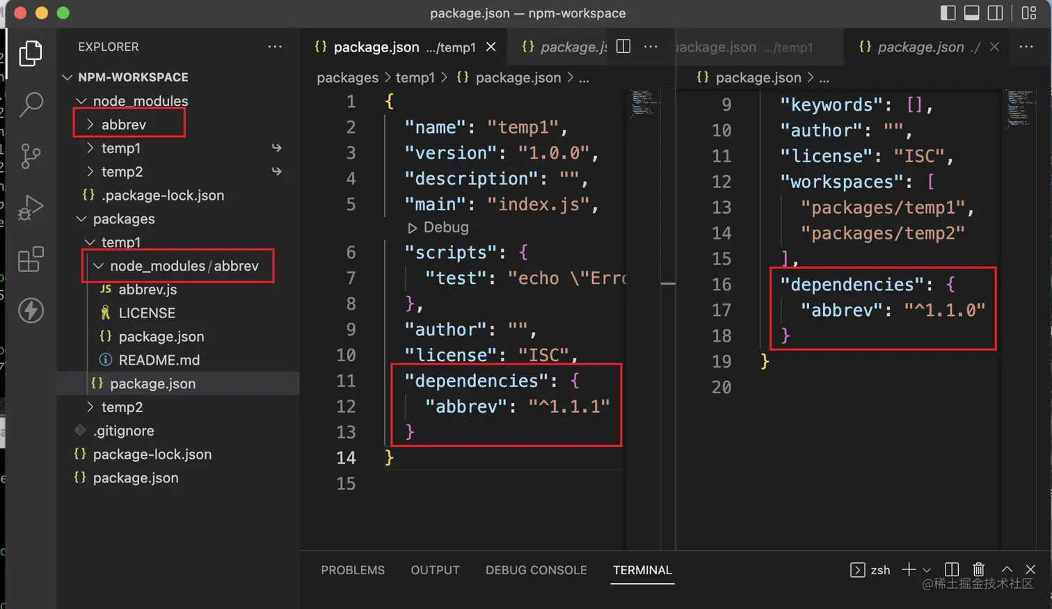 上图中的temp1种abbrev的版本与全局安装的版本不一致,所有会在temp1种创建一个node_modules文件夹。