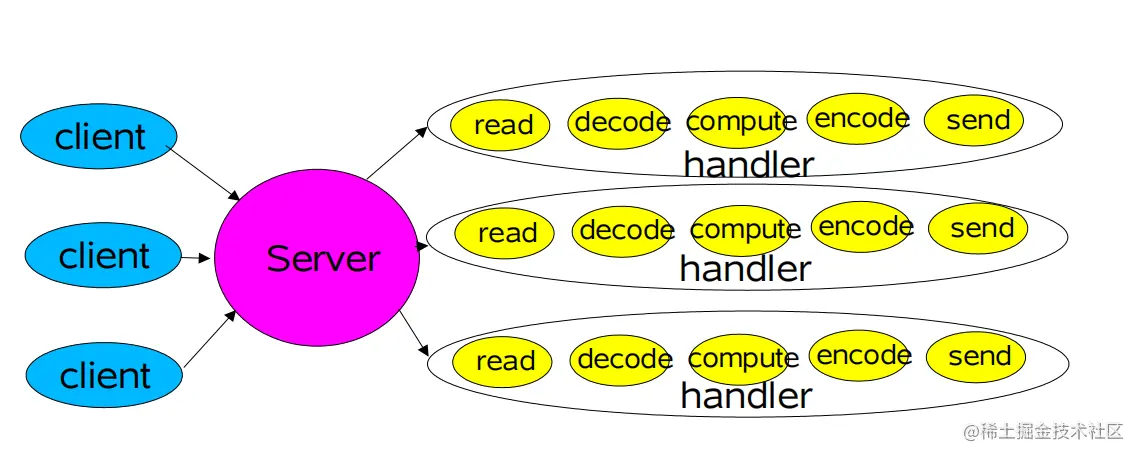 单线程的问题实际上是很明显的。只要其中一个 Handler 方法阻塞了,那就会导致所有的 client 的 Handler 都被阻塞了,也会导致注册事件也无法处理,无法接收新的请求。所以这种模式用的比较少,因为不能充分利用到多核的资源。因此,这种模式仅仅只能处理 Handler 比较快速完成的场景。