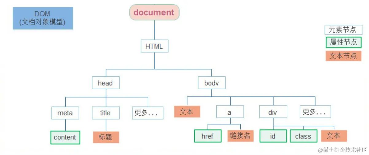 节点是文档树的组成部分,每一个节点都是一个 DOM 对象,主要分为元素节点、属性节 点、文本节点等。