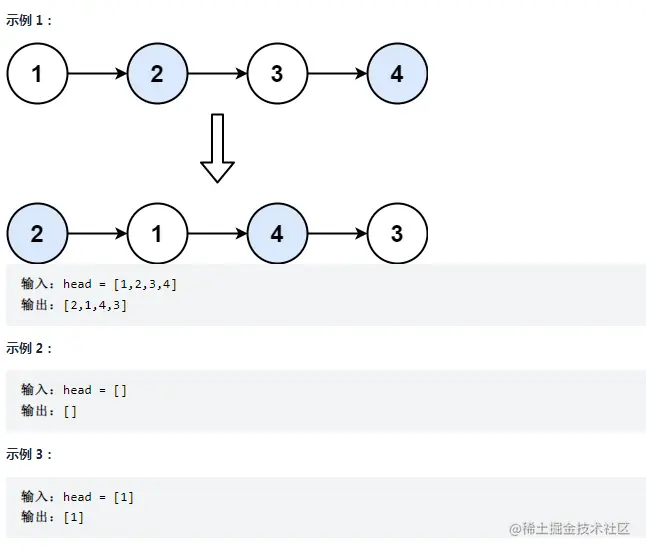 给你一个链表,两两交换其中相邻的节点,并返回交换后链表的头节点。你必须在不修改节点内部的值的情况下完成本题(即,只能进行节点交换)。
