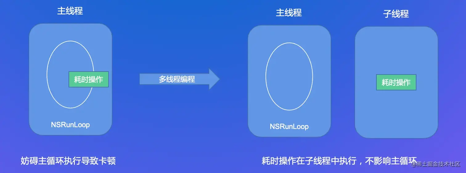 主线程: iOS App 启动时默认会开启一条线程,称为“主线程”。主线程默认开启 RunLoop,使得主线程可以及时刷新 UI 界面和处理 UI 交互事件(如点击、滑动、拖拽等),所以主线程又称为“UI 线程”。耗时操作会妨碍主线程中的主循环的执行,从而引起 App 卡顿问题。通过多线程编程,将耗时操作放到子线程执行,在必要时再回到主线程做刷新操作,可以使程序运行更加流畅。