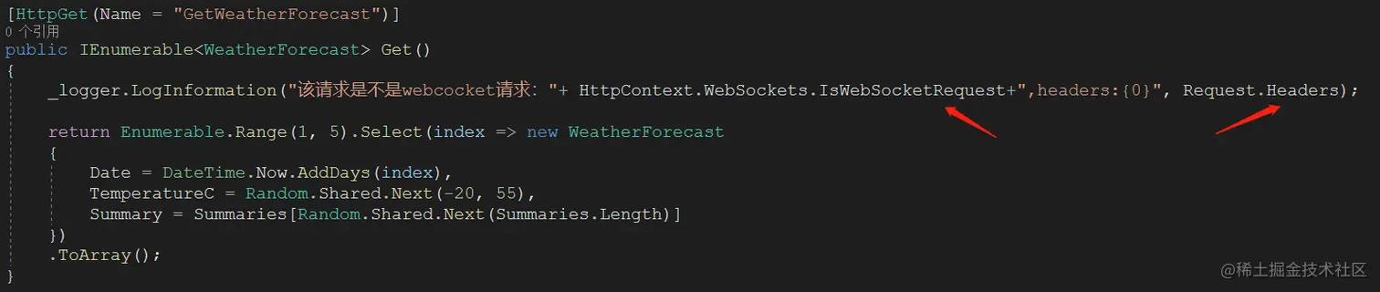 _logger.LogInformation("该请求是不是webcocket请求:"+ HttpContext.WebSockets.IsWebSocketRequest+",headers:{0}", Request.Headers);