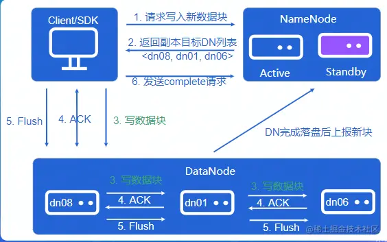 - Client创建新文件的时候,需要有NameNode来确定分配目标DataNode