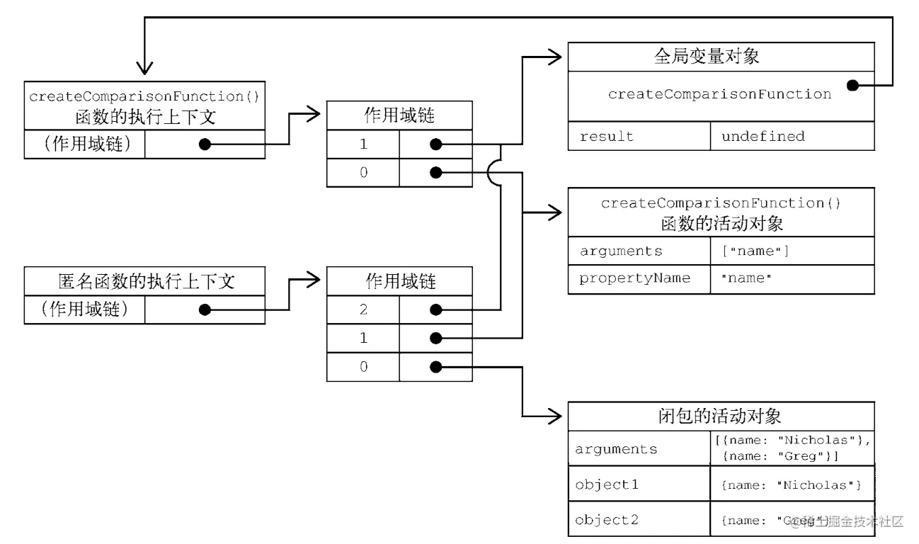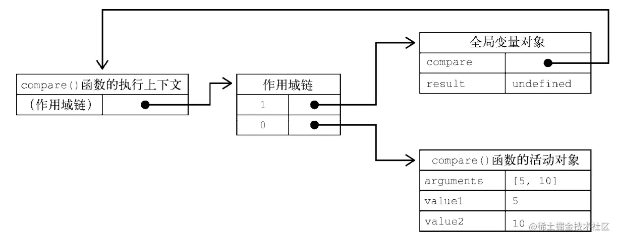 上下文中的代码在执行的时候,会创建变量对象的一个作用域链。这个作用域链决定了各级上下文中的代码在访问变量和函数时的顺序。代码正在执行的上下文的变量对象始终位于作用域链的最前端。如果上下文是函数,则其活动对象用作变量对象。活动对象最初只有一个定义变量:arguments。(全局上下文中没有这个变量)。作用域链中的下一个变量对象来自包含上下文,再下一个对象来自再下一个包含上下文。依次类推直至全局上下文;全局上下文的变量对象始终是作用域链的最后一个变量对象。
