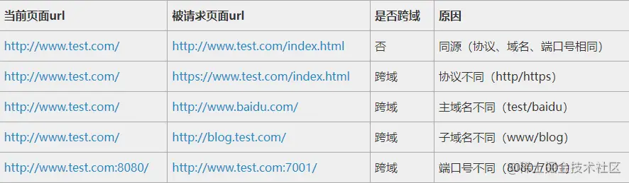 当一个请求url的协议、域名、端口三者之间的任意一个与当前页面url不同即为跨域(如下图所示)。