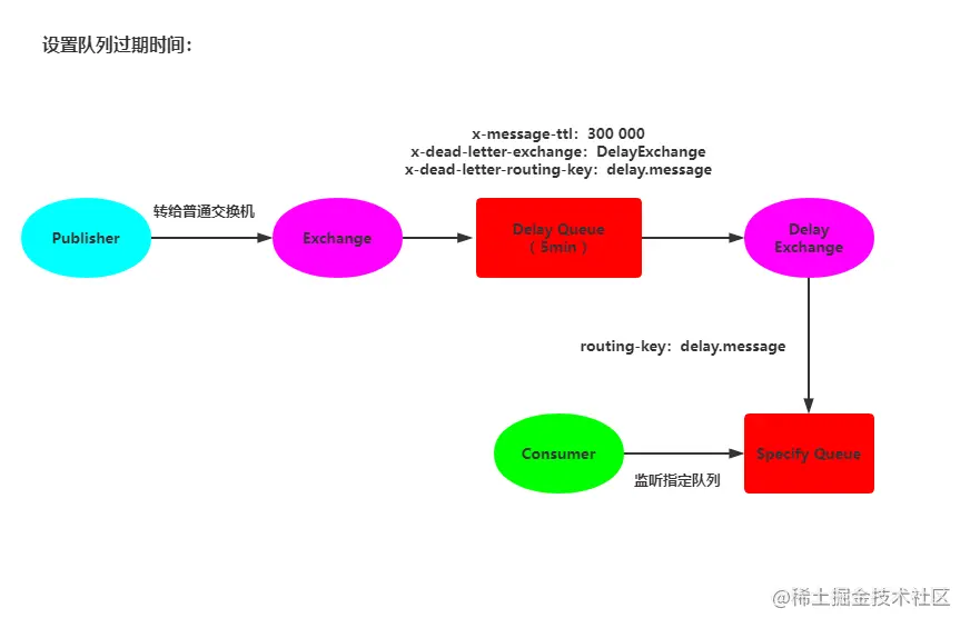 - 接着,交换机会按照路由键把它交给一个延时队列(特殊设置):