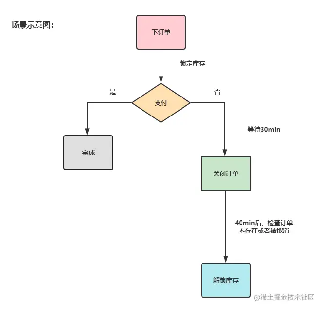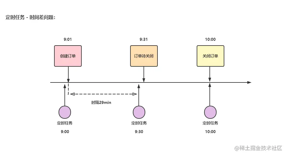 - 时间差问题(主要问题):①.假设9:00刚执行了定时任务,而订单是在9:01下的;②.当9:30再次执行定时任务时,发现该订单还不满足30分钟未支付的关闭订单条件(距离下订单时隔29分钟),结果定时任务刚一结束,这个订单就相当于超时了;③.而当到10:00定时任务再次执行时,该笔订单才会执行库存解锁逻辑(相比预期执行时间晚了29分钟)。这就是定时任务可能会出现的时效性问题。