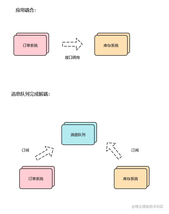 - 假设订单系统依赖于库存系统,而库存系统接口经常发生变化,若采用耦合的方式,一旦库存系统升级,则订单系统必须修改它的代码,重新部署,这样会变得非常麻烦。