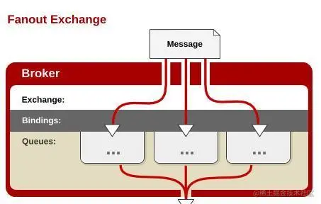 - 不处理路由键。只需要简单的将队列绑定到交换机上。一个发送到交换机的消息都会被转发到与该交换机绑定的所有队列上。很像子网广播,每台子网内的主机都获得了一份复制的消息。