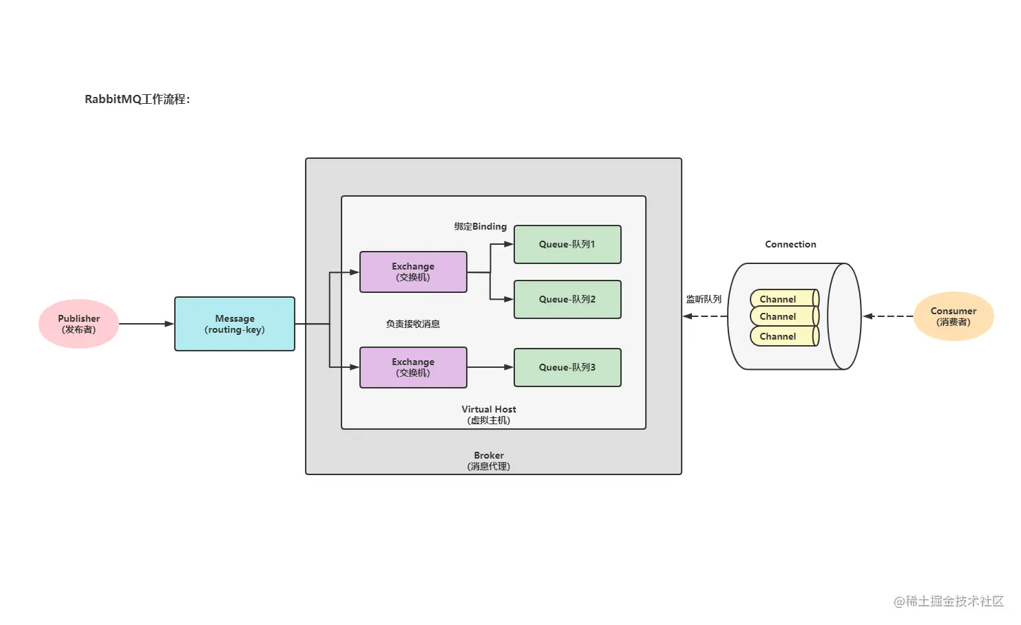 - 我们将消息指定好路由键(即要发给谁)以后,消息(Message)先来到消息代理(Broker)指定的一个虚拟主机(Virtual Host)里边, 由虚拟主机(Virtual Host)指定交换机(Exchange)。