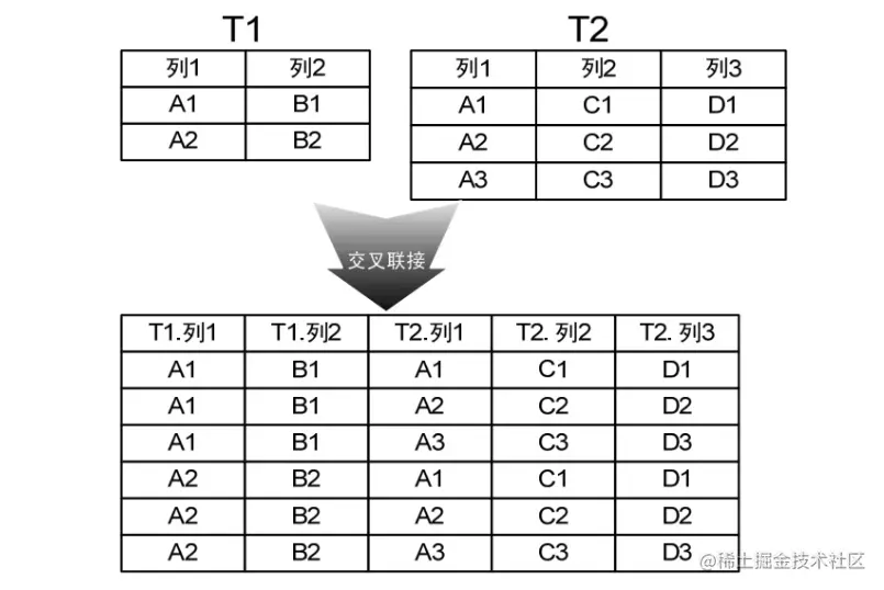 交叉联接是联接查询的第一个阶段,它对两个数据表进行笛卡尔积。即第一张数据表每一行与第二张表的所有行进行联接,生成结果集的大小等于T1*T2。