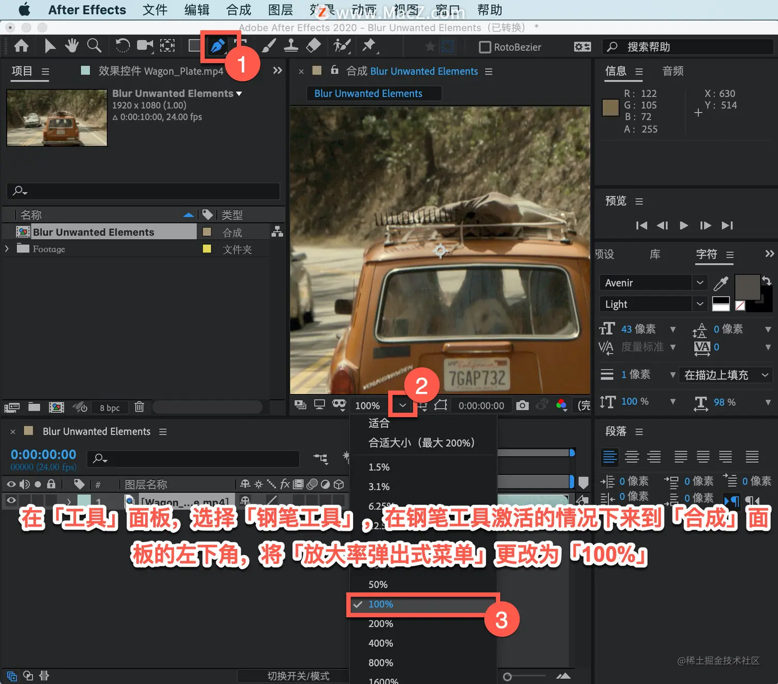 从应用遮罩开始,在「工具」面板,选择「钢笔工具」,在钢笔工具激活的情况下来到「合成」面板的左下角,将「放大率弹出式菜单」更改为「100%」。