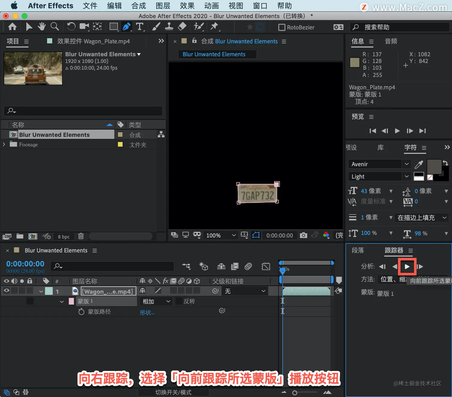 向右跟踪,选择「向前跟踪所选蒙版」播放按钮。继续点击播放,观看这条赛道。