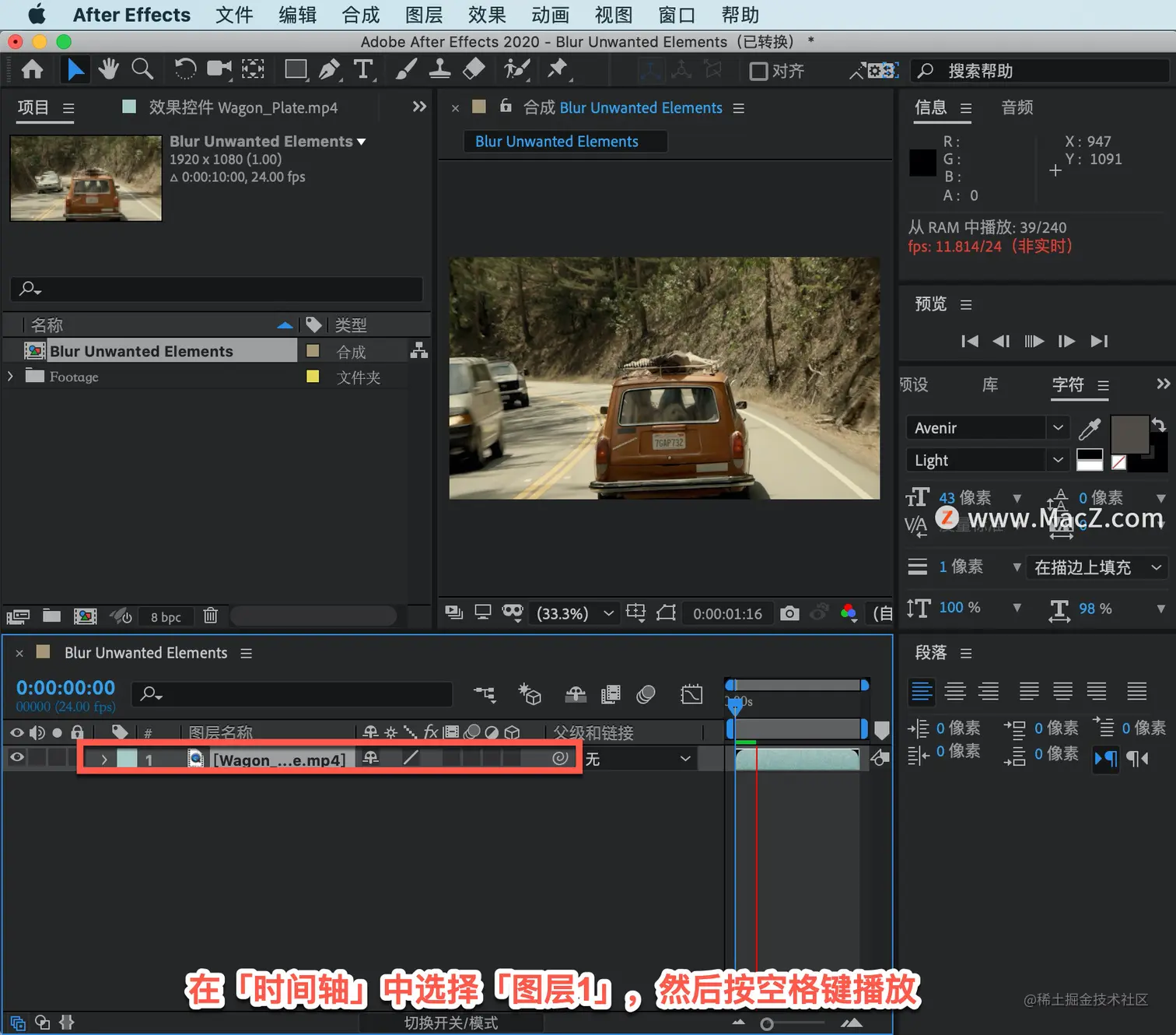 在「时间轴」中选择「图层1」,然后按空格键播放。会注意到这张照片中有相当多的移动,需要在轨迹发生时进行一些小的调整。