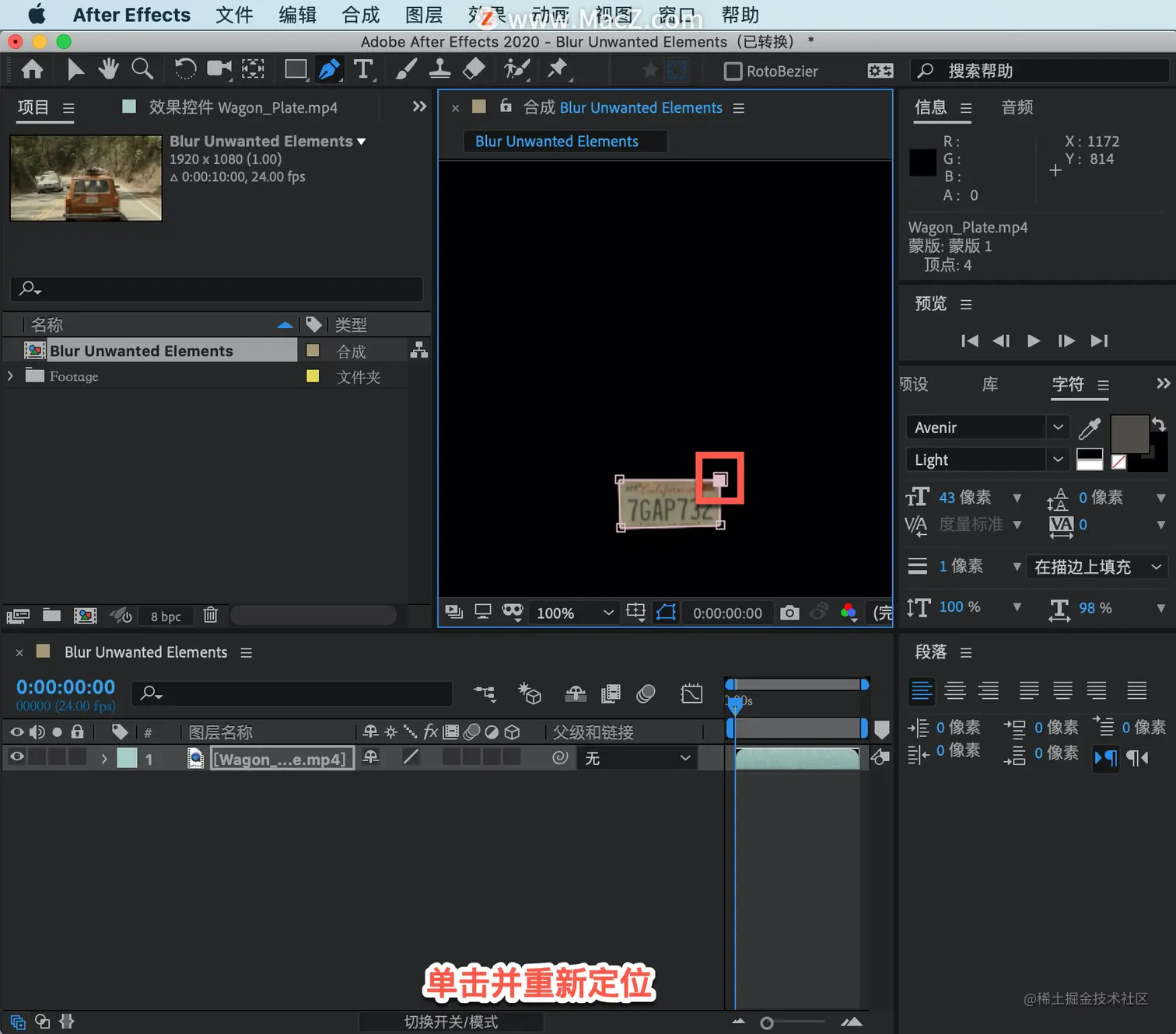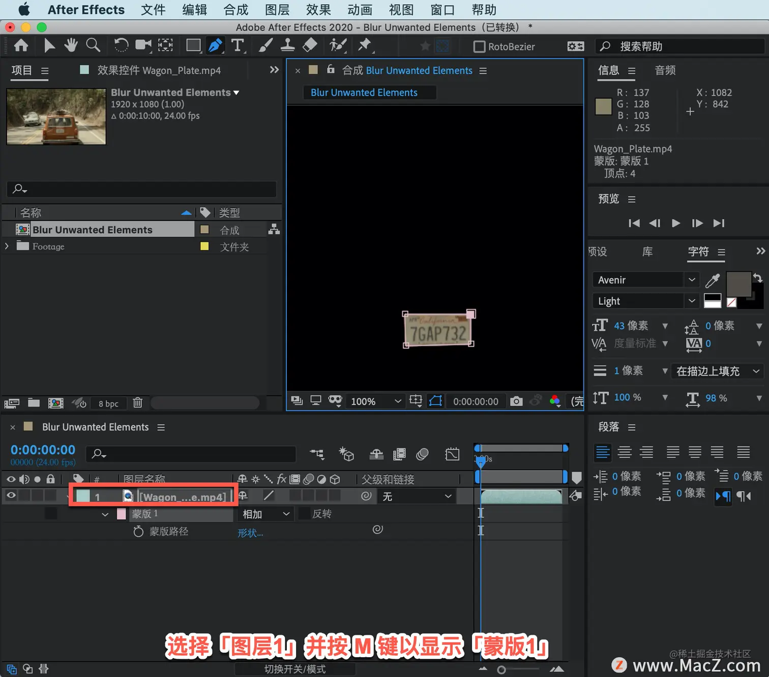 准备开始追踪,现在的位置在0:00:00:000帧上,只需要追踪到右边。要跟踪选择「图层1」并按 M 键以显示「蒙版1」。
