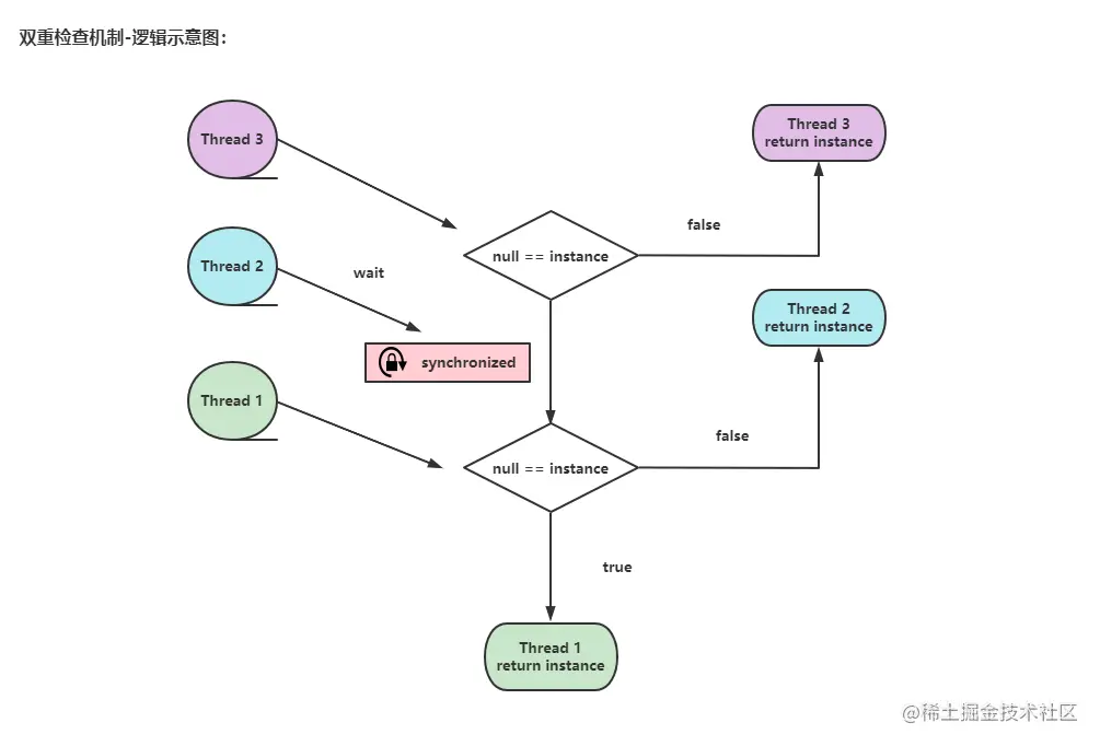 Double-Check概念是多线程常用的。进行两次(null == instance)检查,保证了线程安全。这样