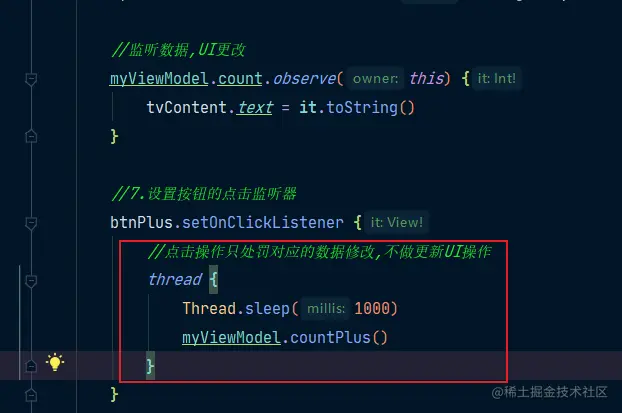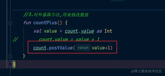 上述代码中,我们通过count.value=value+1来设置数据,这里由于是kotlin的写法所以看不出来是setValue()方法,如果是Java的话,是要调用setValue()方法来设置数据