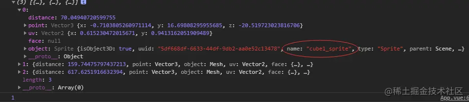 Raycaster类的.intersectObject()办法:检测所有在射线与物体之间,包含或不包含后辈的相交局部。返回后果时,相交局部将按间隔进行排序,最近的位于第一个。