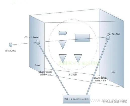 webGL中获取鼠标交互物体的原理:通过三维空间中相机视点与鼠标在屏幕上的地位的连线,造成一条直线,捕捉与此直线相交的空间中的物体,即为交互对象物体。