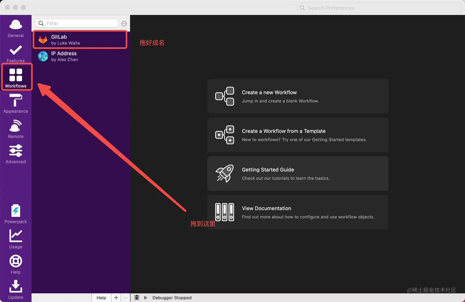 首先亲情奉献了小红帽和GitLab的插件,安装小红帽,成功后,将插件拖到Workflows中,一拖就好,一脱拖成名